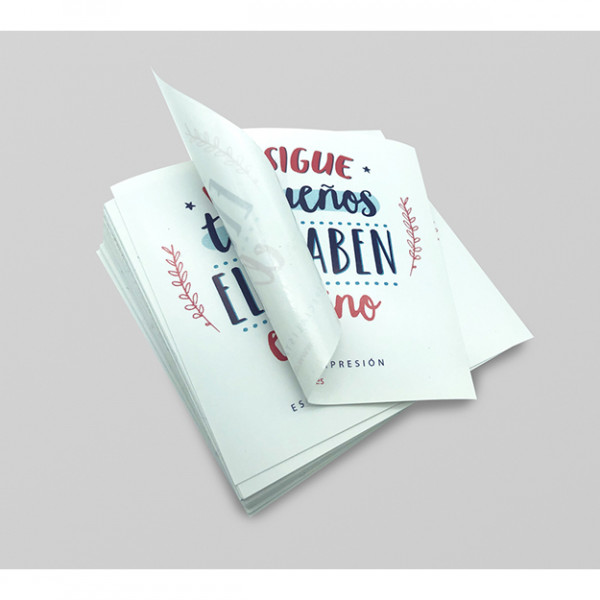 Las pegatinas de papel impresas se conservan por largo tiempo en interiores. Son ideales para pegar sobre cualquier superficie, y el adhesivo pega con gran resistencia.